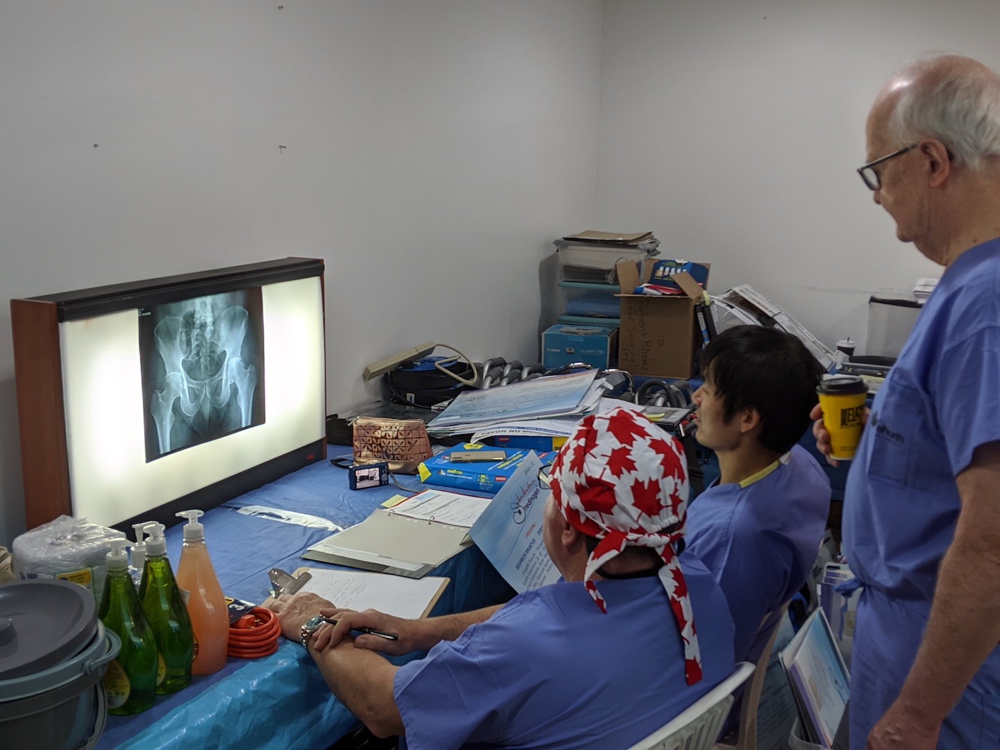 For the morning, the majority of the team is preparing for the day: sterilization of instruments, set up for anesthesia and preparation of patient charts so that we are all ready for the OR around noon. Dr. McIvor, Dr. Lee and Dr. Lavoie all sit in the core office reviewing and templating (sizing implants) for surgeries to take place later in the week.