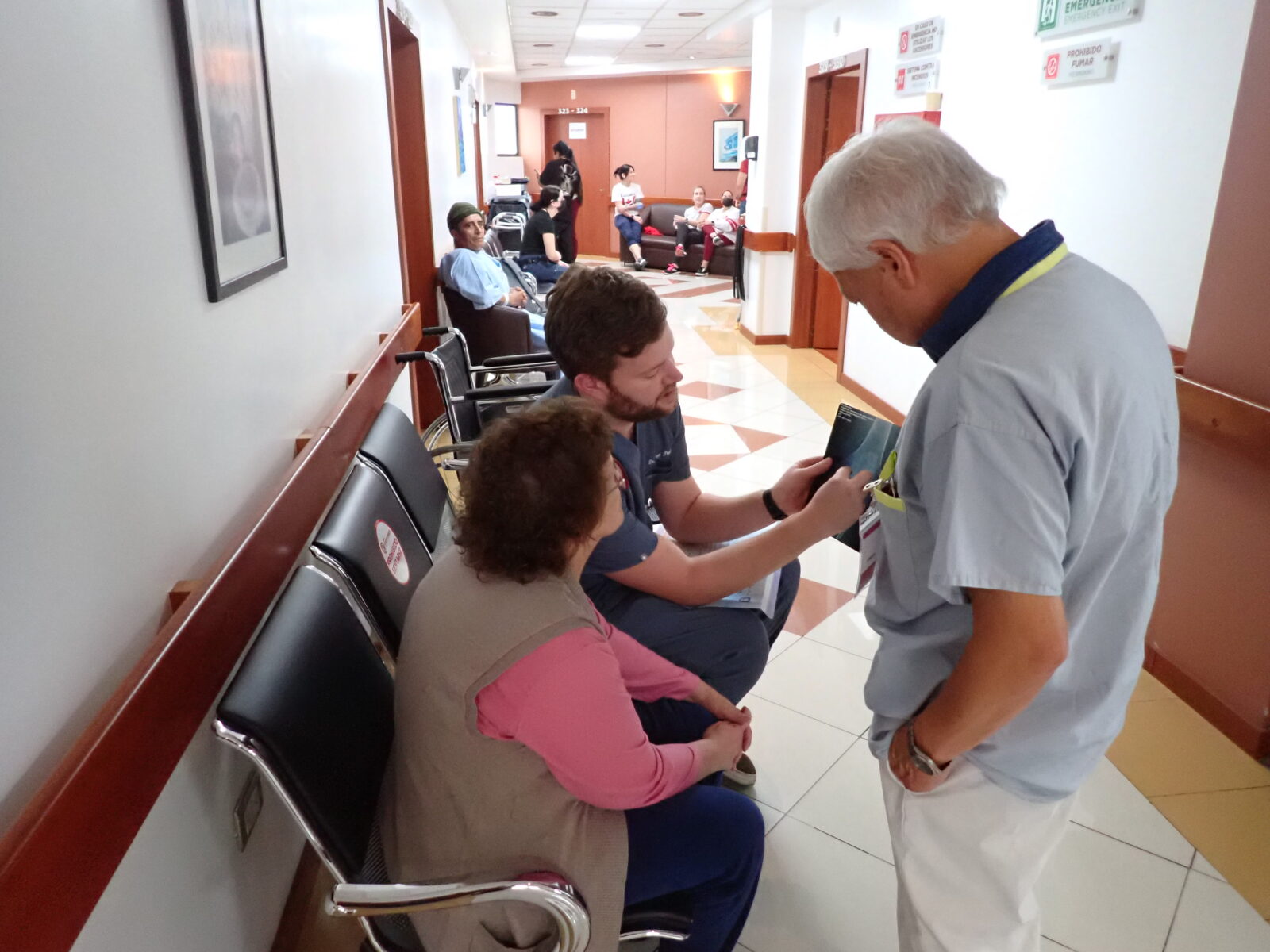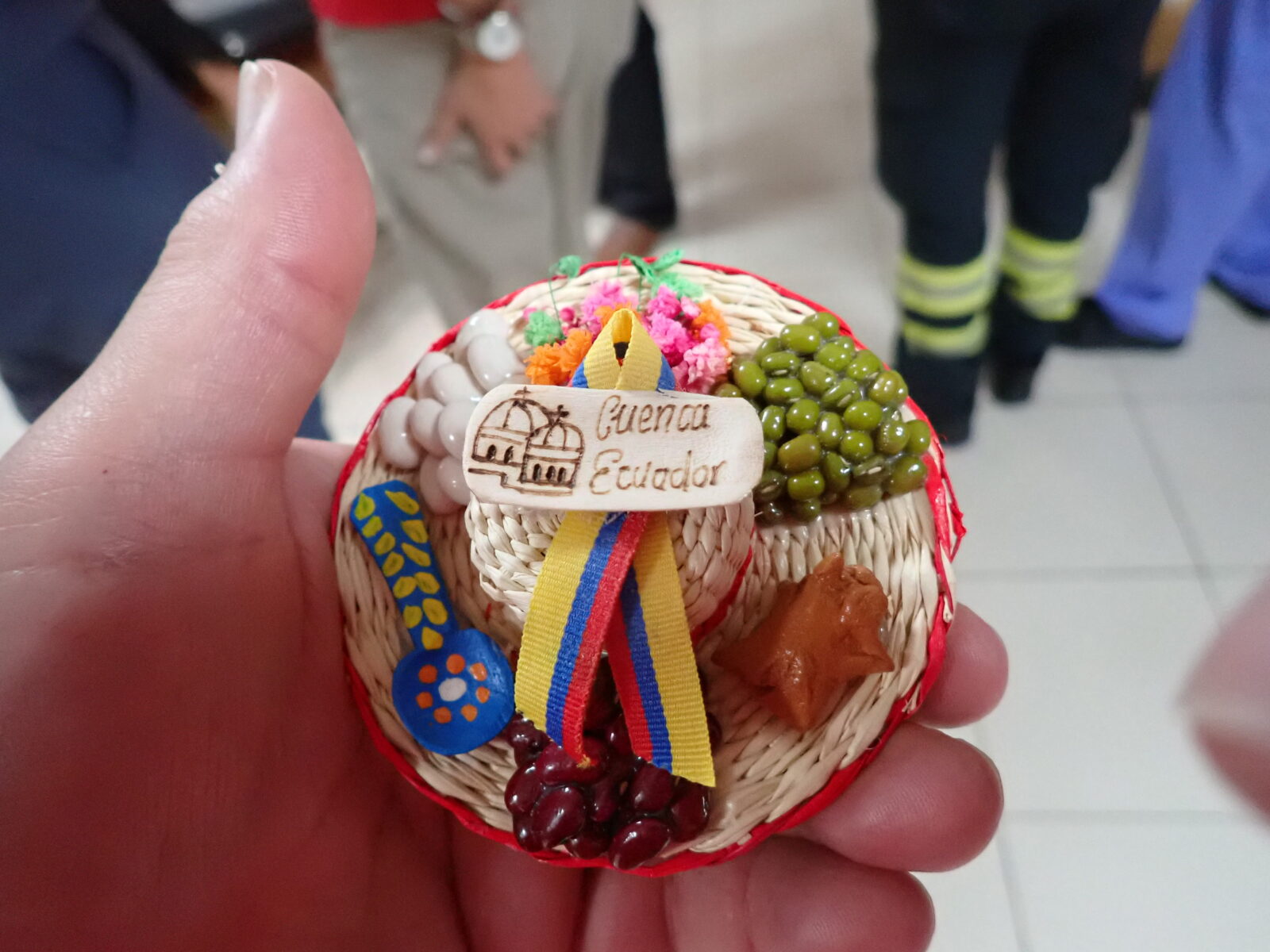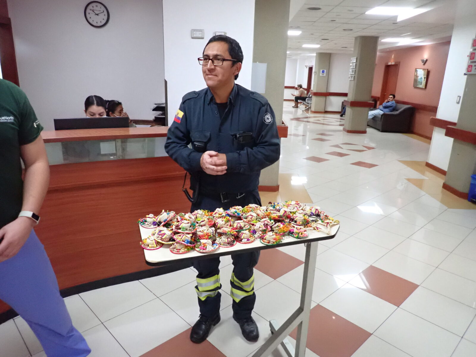 At 10:00AM grand ward rounds started, and the team gathered on the 3rd floor to visit and say goodbye to the remaining patients still at the hospital, many of whom are being discharged today. The team was greeted at the start by a young man and young woman. They were relatives of Nelly, a patient who went home yesterday. They brought a little going away gift and thank you for each team member. Nelly gave us each little miniature Ecuadorian hats decorated with memento’s of Ecuador. They are the perfect size of a Christmas tree ornament, and I will be hanging mine on the tree when I set it up for the Christmas Holidays. She must have spent many hours on the gifts and her relatives were most thankful that we had helped her. She recorded a short thank you video to the team that I hope makes it to a website post.